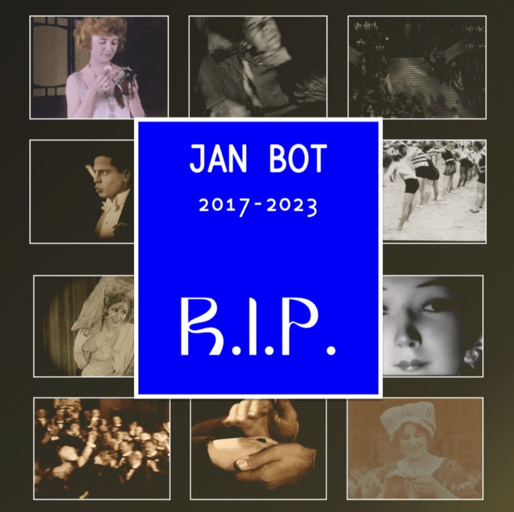 An even more relevant example to AI remix is the EYE’s natural language processing AI, Jan Bot (2017-2023). For almost 6 years, Jan Bot generated its own audiovisual media in real time by combining popular topics from Google Trends with found footage from the EYE’s Bits & Pieces found footage collection. Jan Bot is a perfect example of how AI can be used to re-imagine how neglected aspects of the cinematic cultural past can acquire new relevance when repurposed within newer contexts. One of Jan Bot’s creators, Pablo Núñez Palma, describes the Jan Bot experience as follows: “we see through an old film archive through the eyes of a new technology and, in doing this, we experience machine intelligence as it really is.”[6] Grazia Ingravalle’s new book, Archival Film Curatorship: Early and Silent Cinema from Analog to Digital (2023), is more critical of Jan Bot and other digital remix platforms’ overall archival and curatorial contributions, arguing that their “remixes often stop short of performing the task of historical mediation at the core of historiographic and curatorial work” (91). Yet, the undeniable engagement that the online public has had with Jan Bot, even if just for the sheer novelty of its algorithmic tactics and for the subsequent blockchain NFT marketability of its filmic products, has indicated a new peak in both automated (AI-driven) and online (human) interaction with the Bits & Pieces collection.