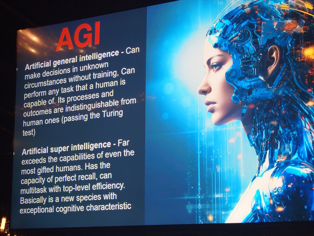 The talk delved deeper into the prospect of AGI (artificial general intelligence), envisioning a future where thousands of agents coexist in a world, contributing to a form of collective intelligence transcending mere generative AI. The exponential learning and creation potential of AGI pose profound implications, raising questions about the evolving role of human experience, learning, and creation.